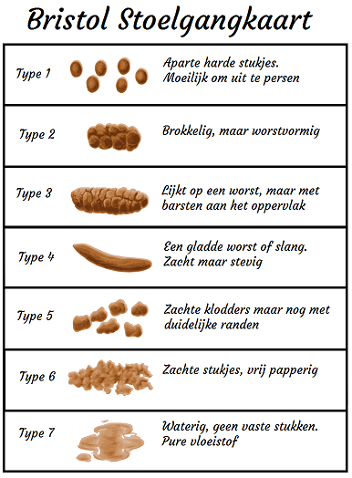 Even terug naar die wc, hoe weet je nou of je gezonde poep hebt of niet? De Bristol stoelgang kaart laat je 7 types van ontlasting zien